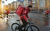 Виды Омска. Жанровая фотография. Курьер службы доставки "Самокат" на велосипеде на улице.