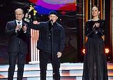 Торжественная церемония вручения Национальной Премии в области кинематографии "Золотой Орел" в 1-м павильоне киноконцерна "Мосфильм". Слева направо: актер Алексей Гуськов, режиссер Алексей Сидоров и телеведущая Дарья Златопольская во время церемонии.