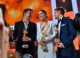 Торжественная церемония вручения Национальной Премии в области кинематографии "Золотой Орел" в 1-м павильоне киноконцерна "Мосфильм". Слева направо: первый заместитель председателя ФГУП "ВГТРК", генеральный директор телекомпании "Россия" Антон Златопольский, продюсер Юлия Сумачева и режиссер Тимур Алпатов на церемонии.