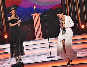 Торжественная церемония вручения Национальной Премии в области кинематографии "Золотой Орел" в 1-м павильоне киноконцерна "Мосфильм". Актриса Юлия Хлынина (в центре) на церемонии.