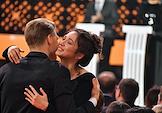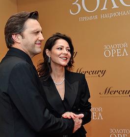 Торжественная церемония вручения Национальной Премии в области кинематографии "Золотой Орел" в 1-м павильоне киноконцерна "Мосфильм". Актеры Елена Лядова (справа) и Владимир Вдовиченков (слева) на церемонии.