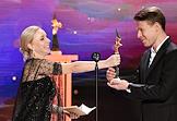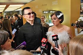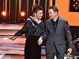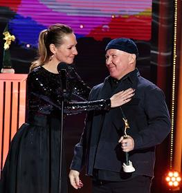 Торжественная церемония вручения Национальной Премии в области кинематографии "Золотой Орел" в 1-м павильоне киноконцерна "Мосфильм". Режиссер Алексей Сидоров (справа) и телеведущая Дарья Златопольская (слева) на церемонии.
