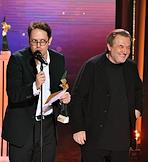 Торжественная церемония вручения Национальной Премии в области кинематографии "Золотой Орел" в 1-м павильоне киноконцерна "Мосфильм". Режиссер Петр Тодоровский (слева) и режиссер, директор студии "Рок" Алексей Учитель (справа) на церемонии.