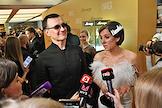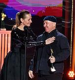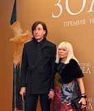 Торжественная церемония вручения Национальной Премии в области кинематографии "Золотой Орел" в 1-м павильоне киноконцерна "Мосфильм". Режиссер, директор студии "Рок" Алексей Учитель (слева) и актриса Анна Банщикова (справа) на церемонии.