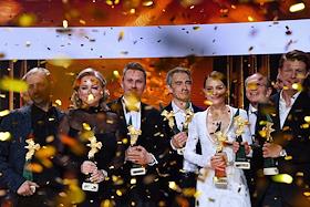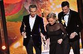 Торжественная церемония вручения Национальной Премии в области кинематографии "Золотой Орел" в 1-м павильоне киноконцерна "Мосфильм". Слева направо: актриса Елена Ербакова, режиссеры Иван Комаров и Андрей Кравчук на церемонии.