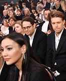 Торжественная церемония вручения Национальной Премии в области кинематографии "Золотой Орел" в 1-м павильоне киноконцерна "Мосфильм". Слева направо: актеры Никита Ефремов, Юлия Хлынина и Иван Янковский во время церемонии.