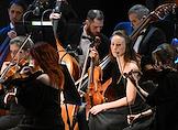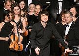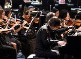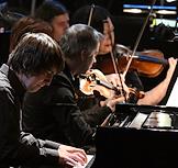 Крещенский фестиваль 2023 в Новой Опере. Концерт симфонической музыки "Адамс, Брамс, Брукнер" на сцене Московского театра "Новая Опера имени Е.В.Колобова". Пианист Алексей Мельников (в центре) во время концерта.
