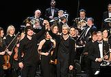 Крещенский фестиваль 2023 в Новой Опере. Концерт симфонической музыки "Адамс, Брамс, Брукнер" на сцене Московского театра "Новая Опера имени Е.В.Колобова". Художественный руководитель и дирижер ансамбля Questa Musica, дирижер Филипп Чижевский (в центре справа) и пианист Алексей Мельников (в центре слева) во время концерта.