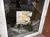 Виды Донецка во время проведения специальной военной операции Вооруженных сил России. Последствия обстрелов. Разбитое окно и объявление "Мы рядом".