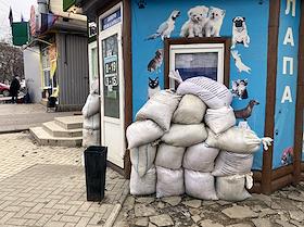 Виды Донецка во время проведения специальной военной операции Вооруженных сил России. Последствия обстрелов. Мешки с песком у магазина для животных.