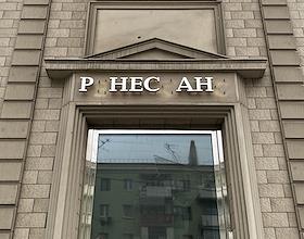 Виды Донецка во время проведения специальной военной операции Вооруженных сил России. Жанровая фотография. Последствия обстрелов. Поврежденная вывеска "Ренессанс".