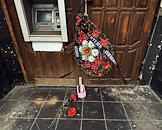 Виды Донецка во время проведения специальной военной операции Вооруженных сил России. Последствия обстрелов. Улица Университетская. Венок от жителей Магадана у входа в отделение Центрального республиканского банка на месте прилетела ракеты "Точка У".