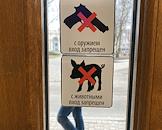Донецк во время проведения специальной военной операции Вооруженных сил России. Объявление входной двери "С оружием вход запрещен", "С животными вход запрещен".