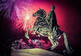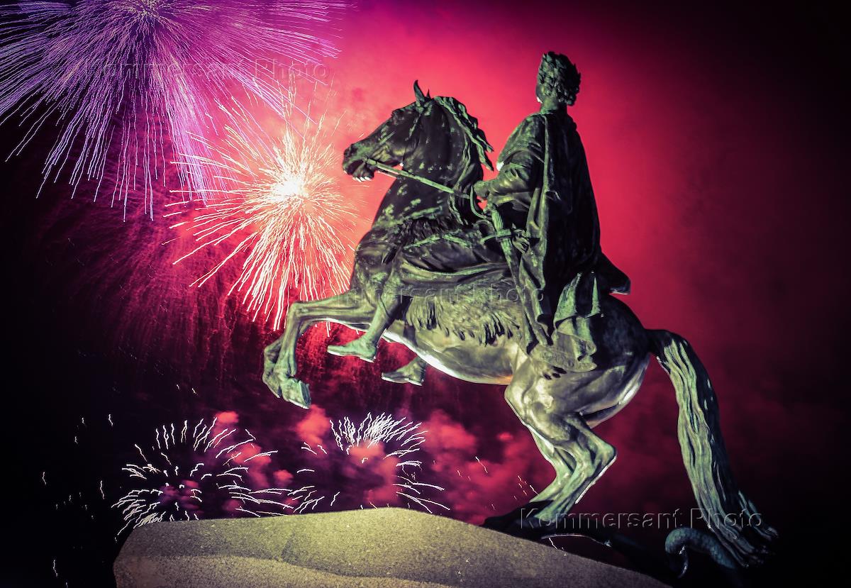 Празднование 79-летия полного освобождения Ленинграда от фашисткой блокады. Праздничный салют. Памятник императору России Петру Первому ("Медный всадник") на Сенатской площади.