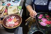 Жостовская фабрика декоративной росписи. Жанровая фотография. Художник рисует орнамент на подносе.