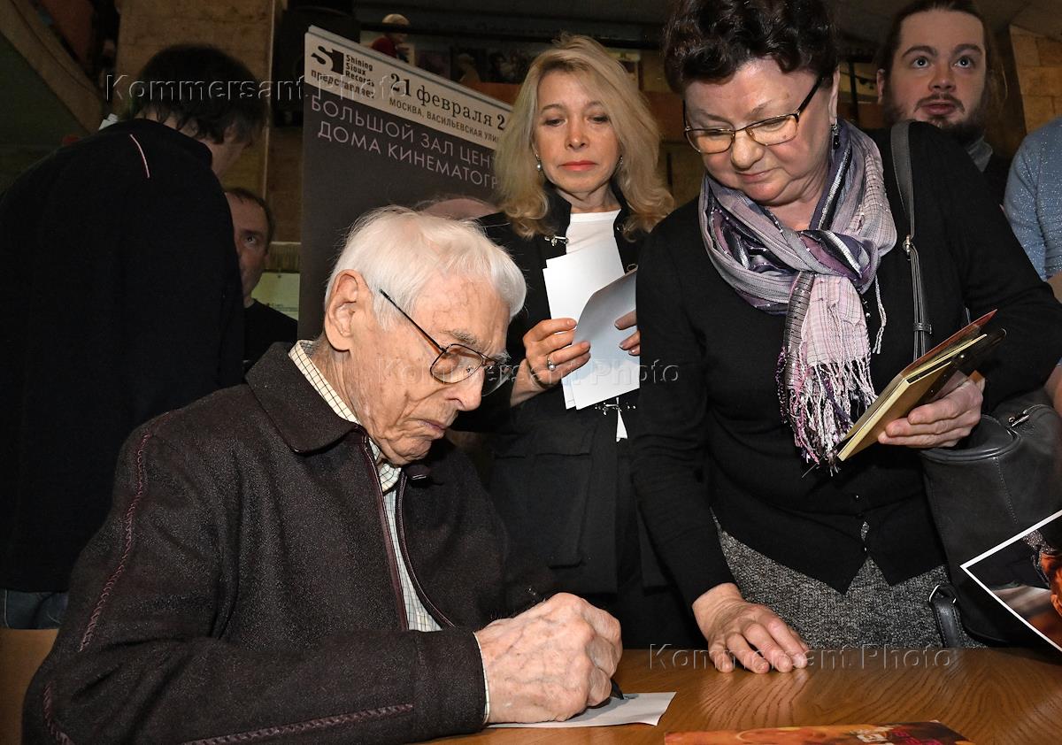 Вечер "Бамбарбия киргуду", посвященный 100-летия со дня рождения режиссера Леонида Гайдая, в Доме кино. Дочь Леонида Гайдая Оксана Гайдай (слева) и композитор Александр Зацепин (справа) на вечере.