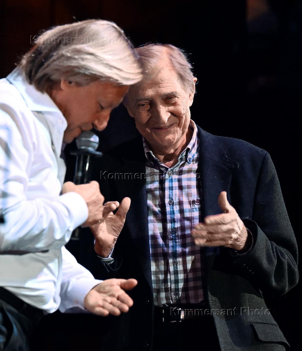 Вечер "Бамбарбия киргуду", посвященный 100-летия со дня рождения режиссера Леонида Гайдая, в Доме кино. Актеры Дмитрий Харатьян (слева) и Леонид Каневский (справа) на вечере.