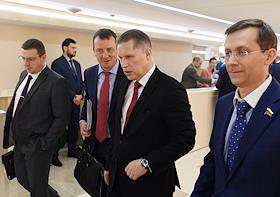 Пленарное заседание Совета Федерации (СФ) России. Слева направо: представитель в СФ России от исполнительного органа государственной власти Тюменской области Павел Тараканов, министр здравоохранения России Михаил Мурашко и его помощник Алексей Кузнецов перед началом заседания.