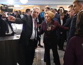 Пленарное заседание Совета Федерации (СФ) России. Члены СФ России перед началом заседания. Председатель комитета СФ России по социальной политике Инна Святенко (справа) перед началом заседания в фойе здания.
