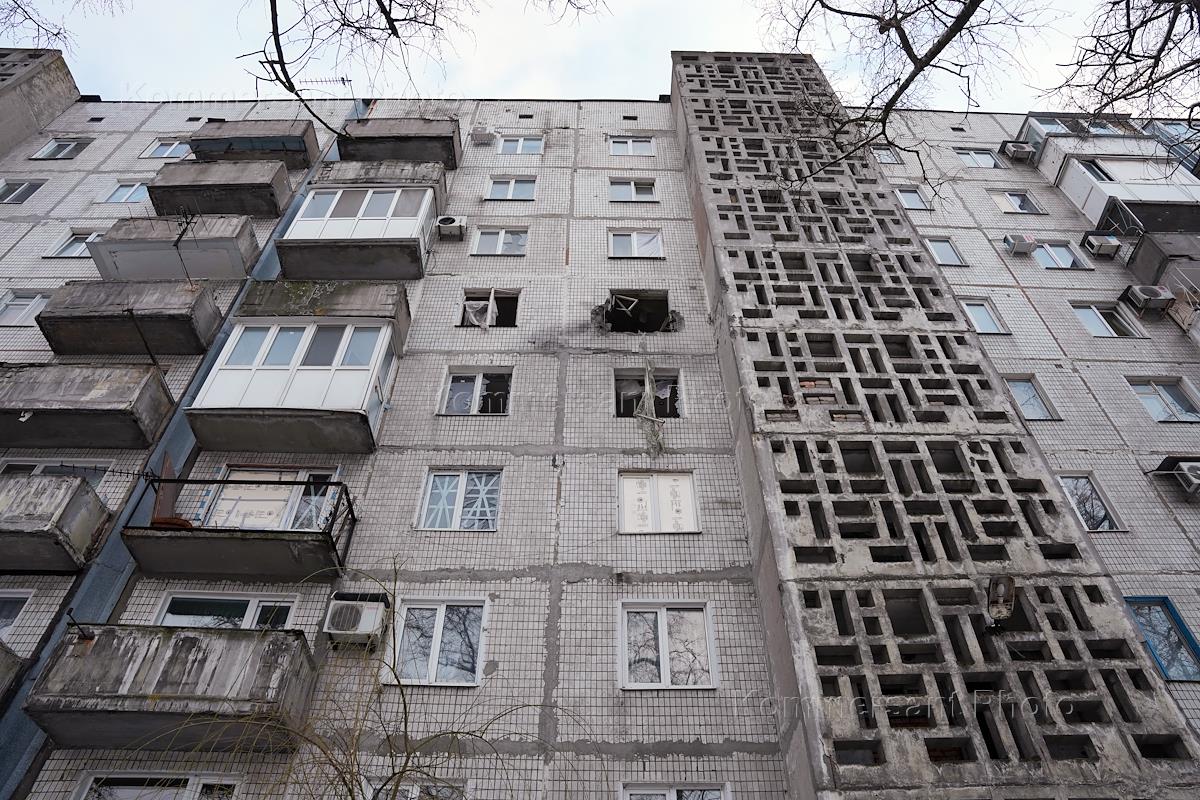 Прямое попадание снаряда в 9-этажный дом в Петровском районе Донецка. Снаряд попал на 6 этаж в кухню, в последствии которого разбита квартира. Пострадавших нет.