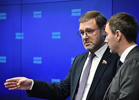 Заседание комиссии Генерального совета партии "Единая Россия" по международному сотрудничеству и поддержки соотечественников. Слева направо: представитель в Совете Федерации России от исполнительного органа государственной власти Республики Марий Эл Константин Косачев, первые заместители председателя комитета Государственной думы (ГД) России по международным делам Светлана Журова и Алексей Чепа перед началом заседания.