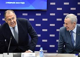Заседание комиссии Генерального совета партии "Единая Россия" по международному сотрудничеству и поддержки соотечественников. Министр иностранных дел России Сергей Лавров (слева) и представитель в Совете Федерации России от исполнительного органа государственной власти Республики Марий Эл Константин Косачев (справа) перед началом заседания.