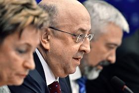 Заседание комиссии Генерального совета партии "Единая Россия" по международному сотрудничеству и поддержки соотечественников. Сопредседатель Ассоциации юристов России (АЮР) Владимир Плигин (в центре) во время заседания.