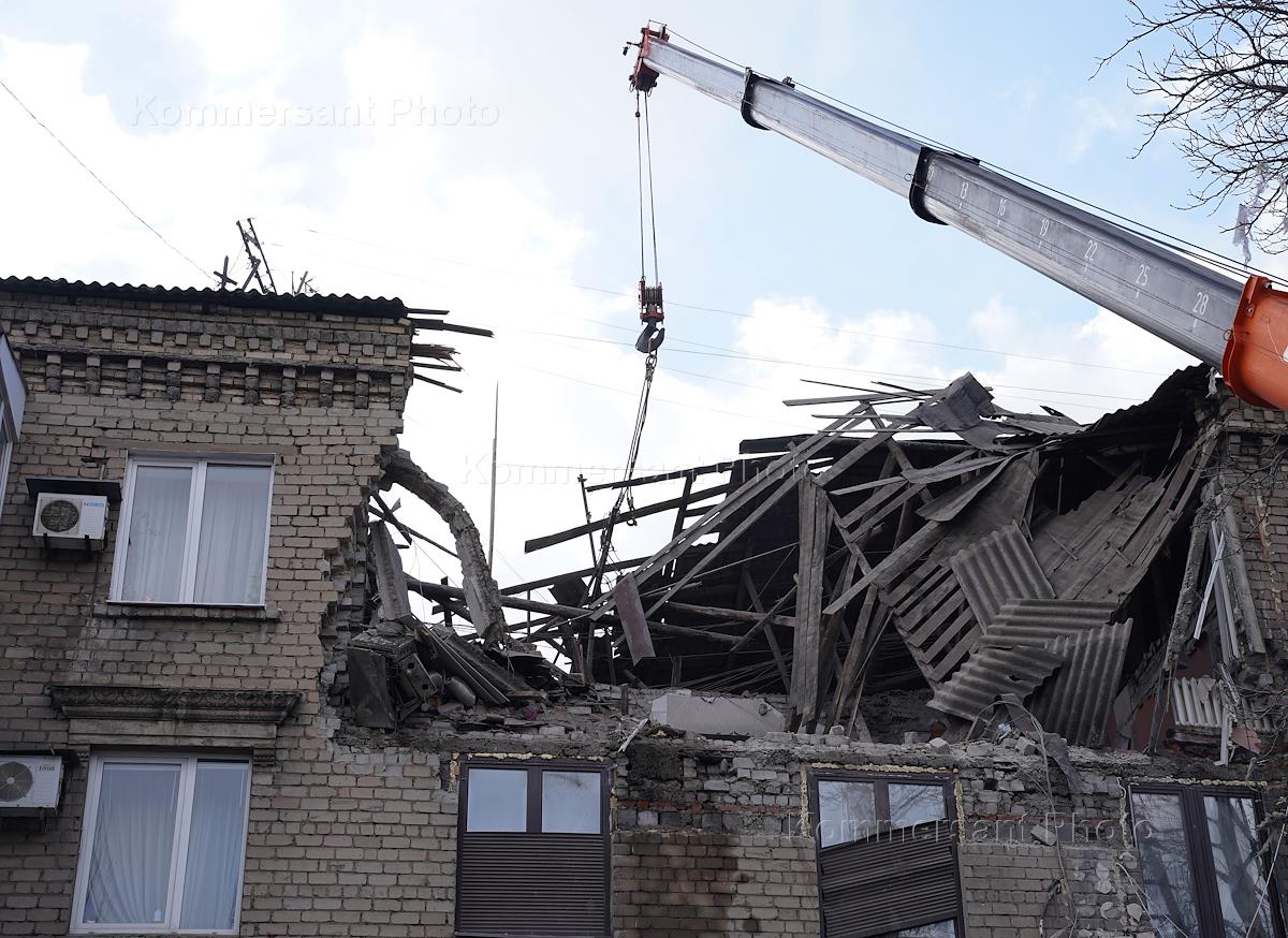 Виды Донецка во время проведения специальной военной операции Вооруженных сил России. Последствия обстрела Киевского района. Многоквартирный жилой дом на улице Артема, поврежденный в результате обстрела. Сотрудники МЧС во время разбора завалов.