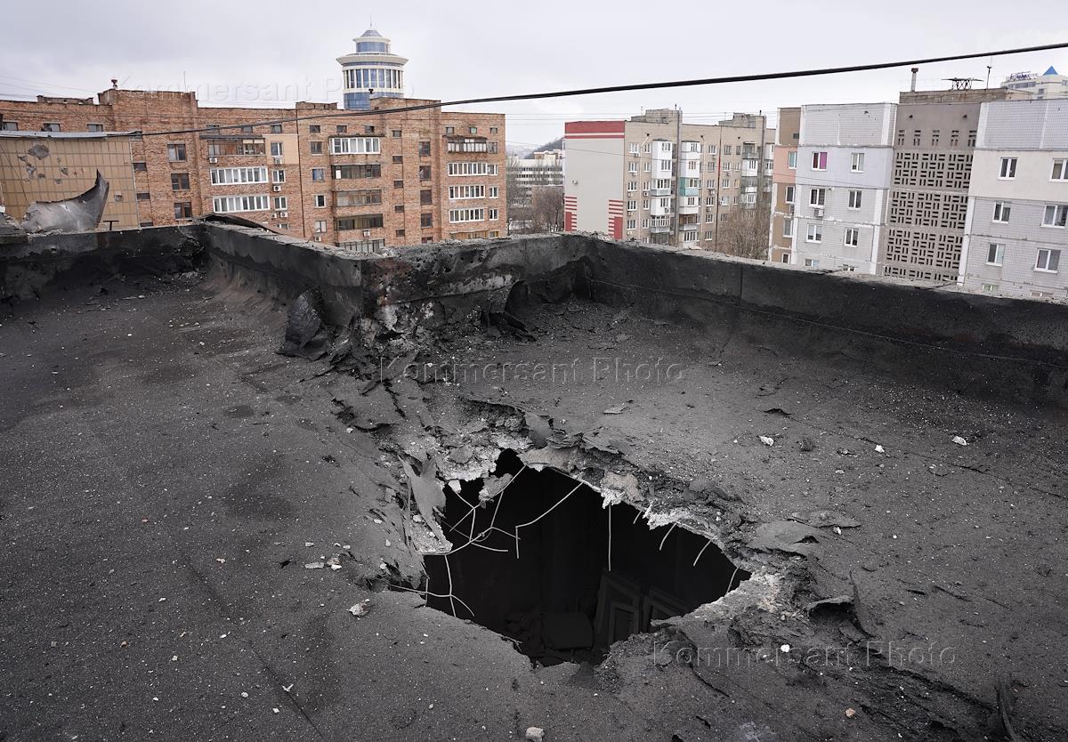 Виды Донецка во время проведения специальной военной операции Вооруженных сил России. Последствия обстрела Киевского района. Осколок снаряда и разрушенная крыше многоквартирного жилого дома.