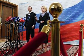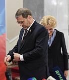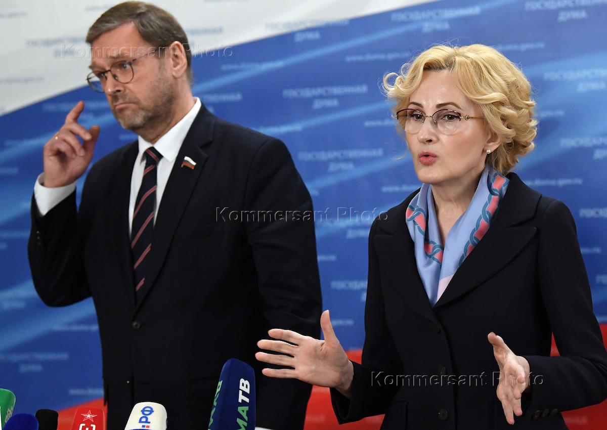 Заседание Парламентской комиссии по расследованию деятельности биолабораторий США на Украине в Государственной думе (ГД) России. Заместитель председателя Совета Федерации России Константин Косачев (слева) и заместитель председателя ГД России Ирина Яровая (справа) во время пресс-подхода после заседания.