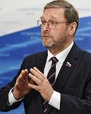 Заседание Парламентской комиссии по расследованию деятельности биолабораторий США на Украине в Государственной думе (ГД) России. Заместитель председателя Совета Федерации России Константин Косачев во время пресс-подхода после заседания.