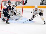 Фонбет Чемпионат КХЛ. Матч по хоккею между командами "Торпедо" (Нижний Новгород) и "Адмирал" (Владивосток) на стадионе "Нагорный". Справа налево: игрок команды "Адмирал" Колби Уильямс, игрок команды "Торпедо" Владислав Фирстов и вратарь команды "Адмирал" Павел Хомченко во время матча.