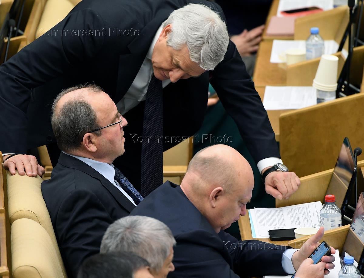 Пленарное заседание Государственной думы (ГД) России. Слева направо: член комитета ГД России по бюджету и налогам Виктор Селиверстов, первый заместитель председателя комитета ГД России по охране здоровья Леонид Огуль и первый заместитель председателя комитета ГД России по обороне Андрей Красов во время заседания.