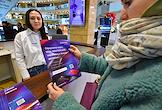 Офлайн-магазин EasyPay.World по продаже карт иностранных банков в торгово-развлекательном центре "Афимолл Сити". Жанровая фотография. Покупатели возле стойки.