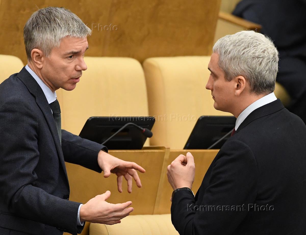 Plenary session of the State Duma of Russia. First Deputy Committee of the Russian State Duma on Culture Dmitry Pevtsov (left) and Chairman of the Russian State Duma Committee on Budget and Taxes Andrey Makarov (right) before the meeting.