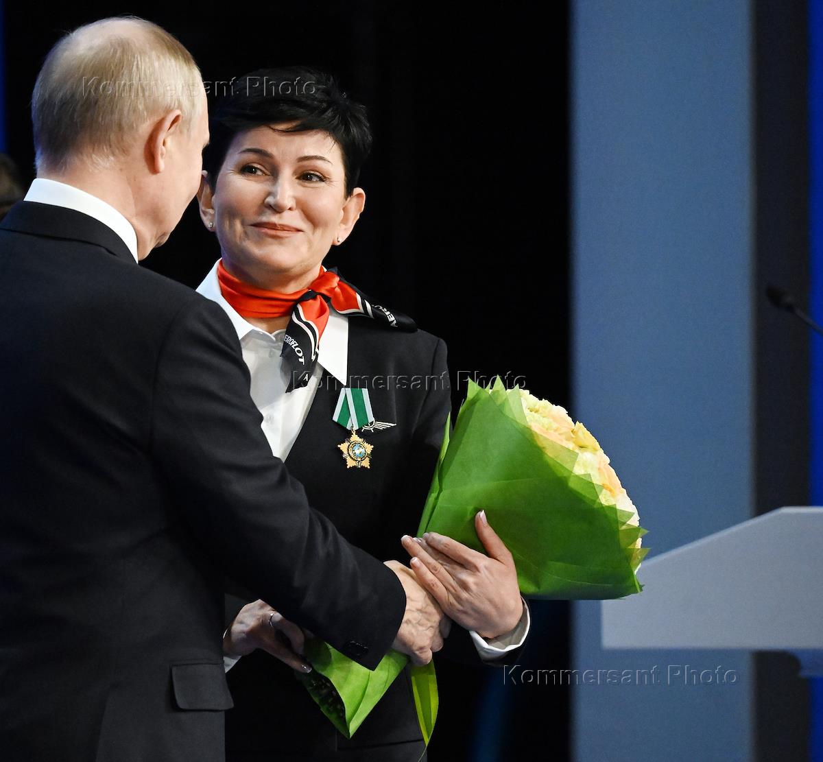 The ceremony of presenting state awards at the gala evening in honor of the 100th anniversary of domestic civil aviation in the State Kremlin Palace. Russian President Vladimir Putin (left) and Pobeda flight attendant Victoria Golubyeva (right) during the ceremony.