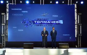 Церемония открытия нового терминала аэропорта Толмачево им. А.И. Покрышкина в день 100-летия российской гражданской авиации. Новый пассажирский терминал площадью более 58 тыс. кв. м оснастили шестью телескопическими трапами и 54 стойками регистрации. Запланированная пропускная способность составит 1 844 пассажира в час.