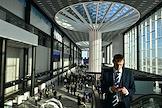 Церемония открытия нового терминала аэропорта Толмачево им. А.И. Покрышкина в день 100-летия российской гражданской авиации. Жанровая фотография. Пассажиры на эскалаторе терминала.