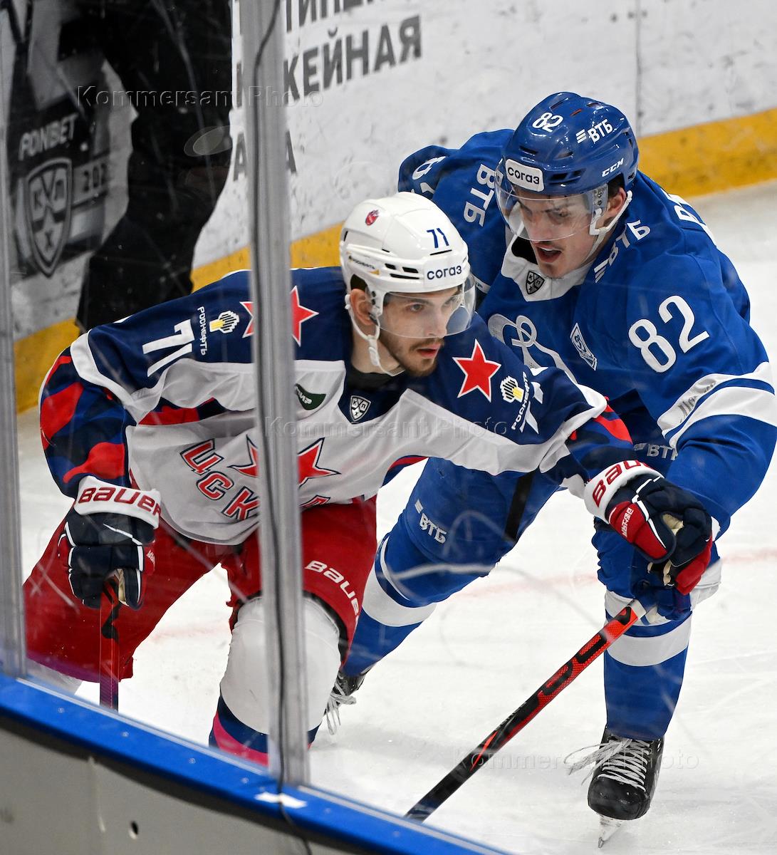Континентальная хоккейная лига (КХЛ). Чемпионат сезона 2022/23. Матч между командами "Динамо" (Москва) - ЦСКА (Москва) на стадионе ВТБ "Арена". Игрок команды "Динамо" Дмитрий Рашевский (слева) во время матча.