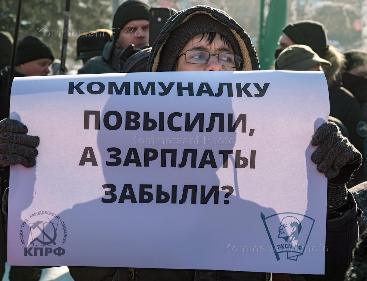Митинг, организованный Коммунистической партией, против повышения цен ЖКХ. Жанровая фотография. Мужчина держит табличку с надписью "Против роста тарифов ЖКХ!".