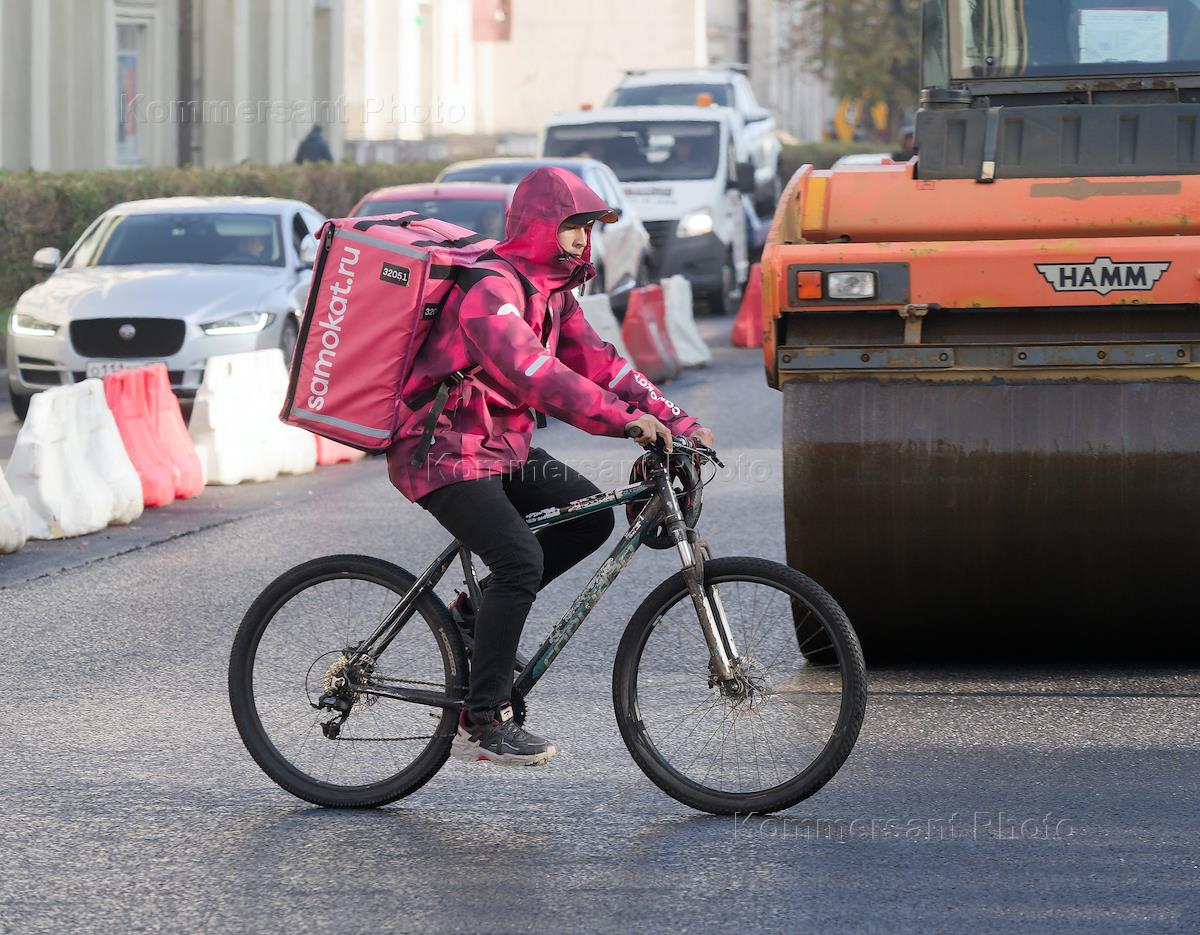 Жанровая фотография. Курьер службы доставки "Самокат" на велосипеде.