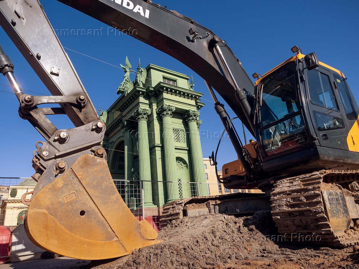 Виды Санкт-Петербурга. Жанровая фотография. Экскваватор во время дорожных работ у Нарвских триумфальных ворот на площади Cтачек.