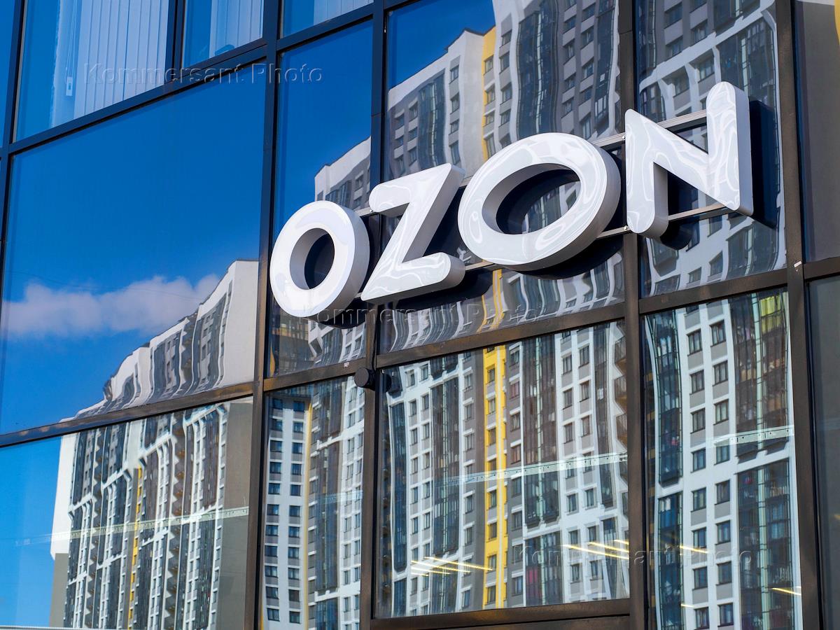 Жанровая фотография. Вывеска пункта выдачи интернет-магазина OZON и отражение жилого дома в окнах офисного здания.