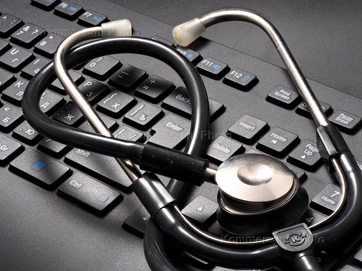 Жанровая фотография. Фонендоскоп лежит на клавиатуре компьютера.
