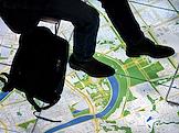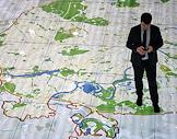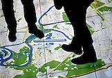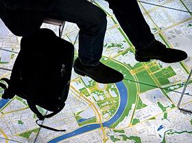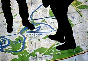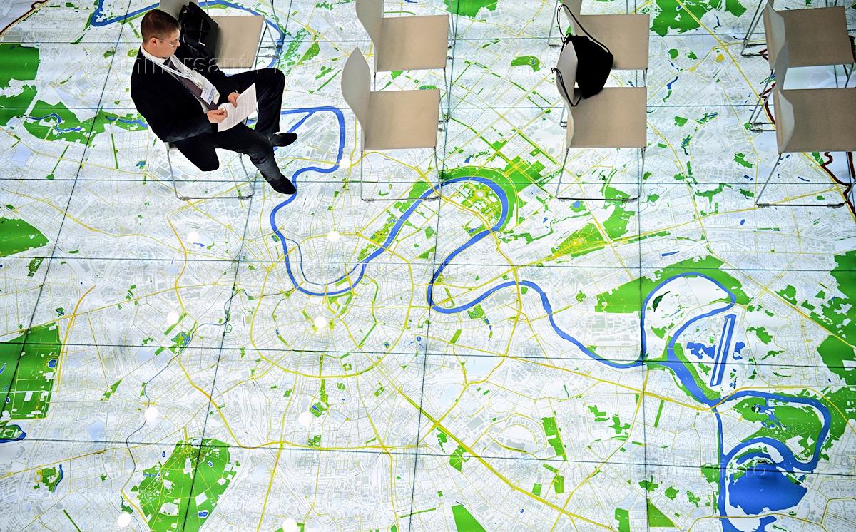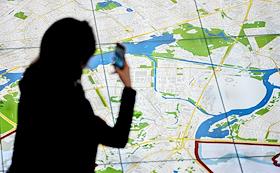 II Ежегодный форум "Технологии большого города" на площадке информационно-аналитического центра Комплекса градостроительной политики и строительства города Москвы "Мосстройинформ". Жанровая фотография. Силуэт человека на интерактивной карте Москвы.