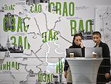 II Ежегодный форум "Технологии большого города" на площадке информационно-аналитического центра Комплекса градостроительной политики и строительства города Москвы "Мосстройинформ". Жанровая фотография. Участники форума на фоне интерактивной карты Москвы.