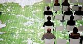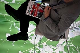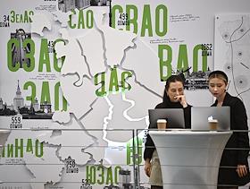 II Ежегодный форум "Технологии большого города" на площадке информационно-аналитического центра Комплекса градостроительной политики и строительства города Москвы "Мосстройинформ". Жанровая фотография. Участники форума на фоне карты Москвы, разделенной на округа.