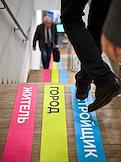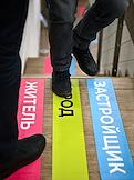 II Ежегодный форум "Технологии большого города" на площадке информационно-аналитического центра Комплекса градостроительной политики и строительства города Москвы "Мосстройинформ". Жанровая фотография. Надписи "Застройщик", "Город", "Житель" на полу центра.