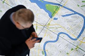 II Ежегодный форум "Технологии большого города" на площадке информационно-аналитического центра Комплекса градостроительной политики и строительства города Москвы "Мосстройинформ". Жанровая фотография. Человек на фоне интерактивной карты Москвы.