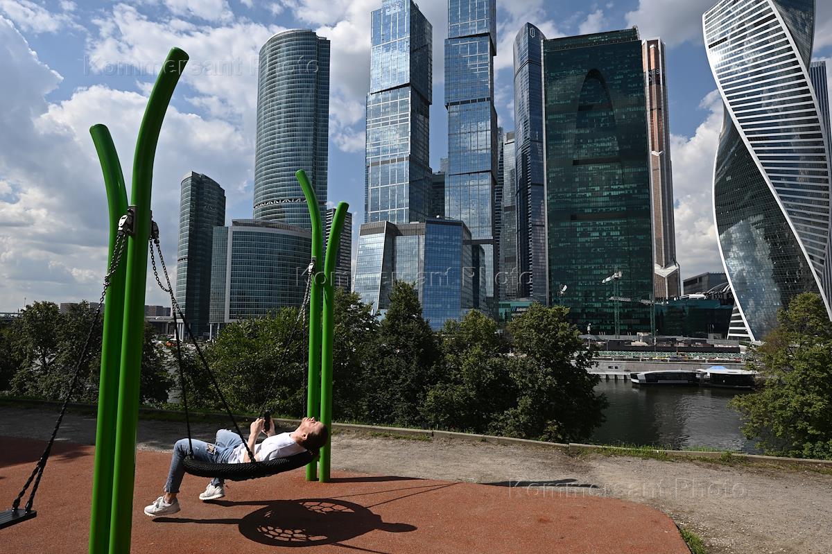 Виды Москвы. Московский международный деловой центр "Москва-Сити". Жанровая фотография. Молодой человек отдыхает в парке у набережной Москва-реки.